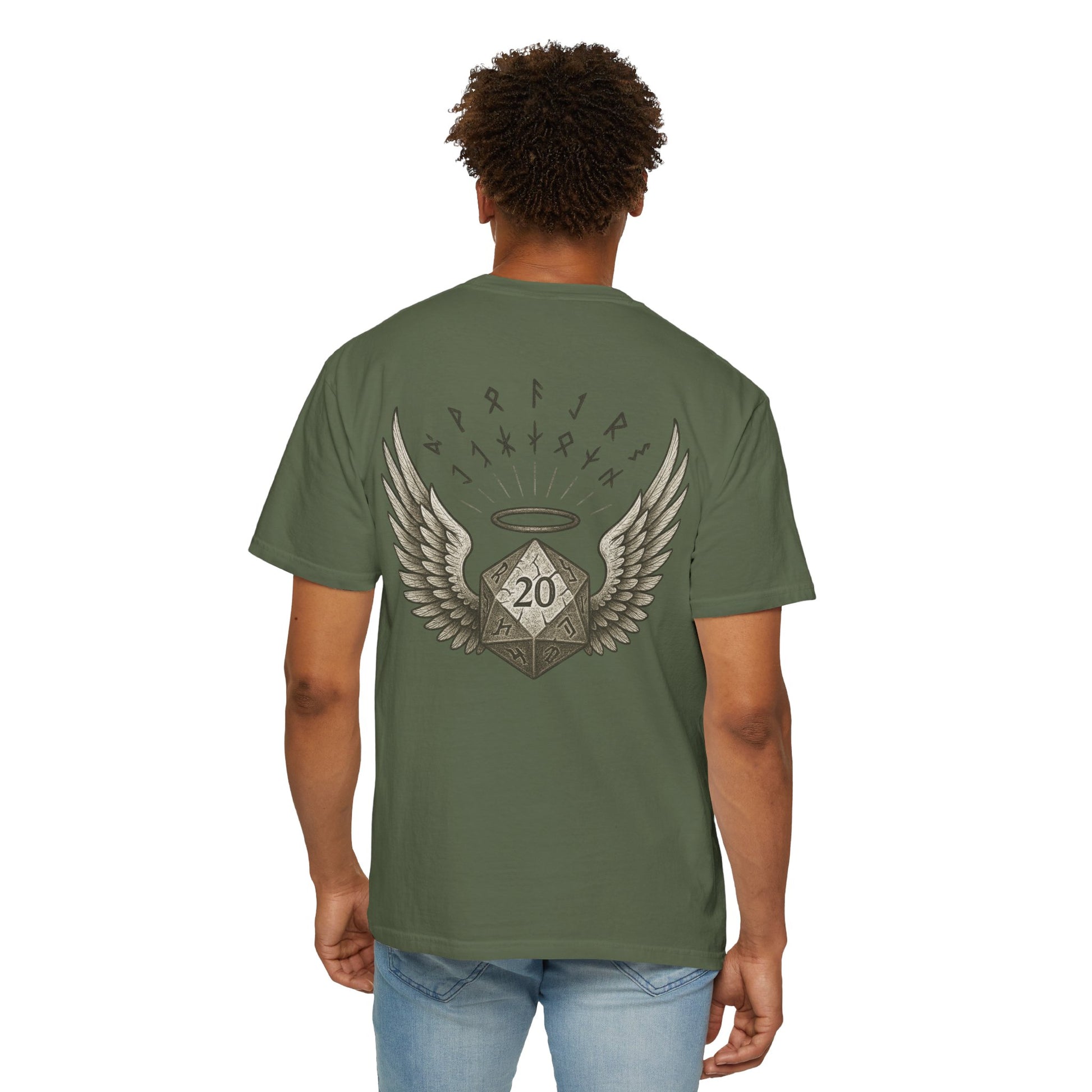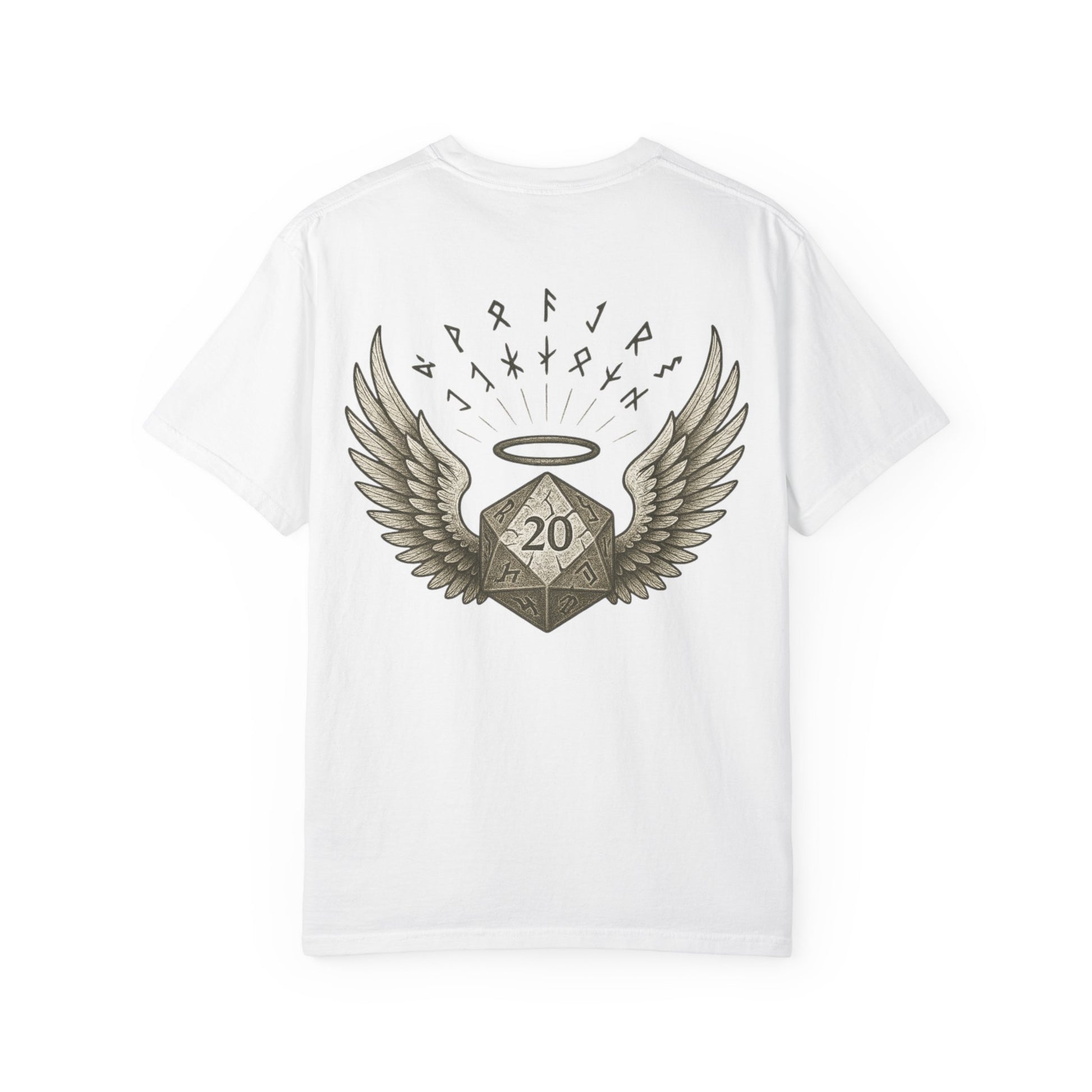 Featuring a winged D20 design with subtle mythic styling, this shirt keeps things playful without going over the top. It’s printed on soft, garment-dyed cotton with a relaxed fit, making it easy to wear through long sessions, conventions, or casual game nights.
